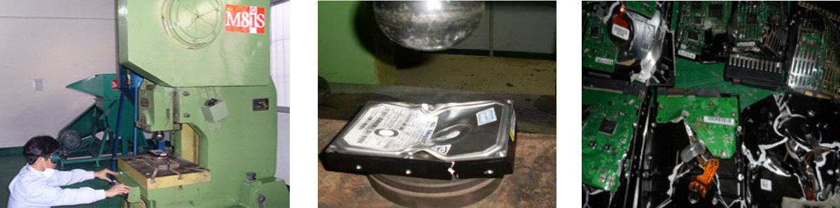 4、沖壓:沖壓服務(wù)是我公司為消除客戶的對(duì)消磁后是否能完全清除機(jī)密信息,確保信息不能再恢復(fù)的懷疑,利用沖壓機(jī)將存儲(chǔ)介質(zhì)再進(jìn)行物理銷毀,改變其物理結(jié)構(gòu),使其徹底報(bào)廢。