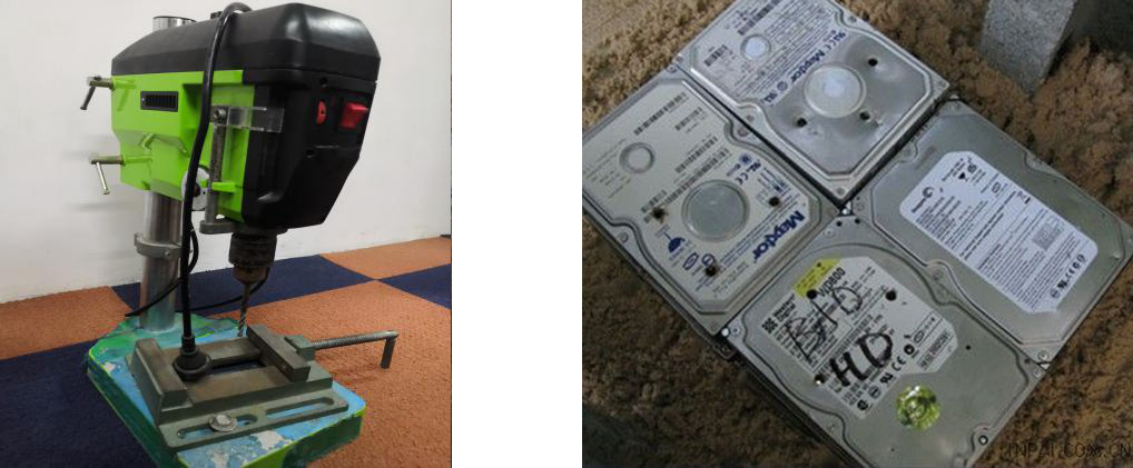 3、打孔:在客戶現(xiàn)場(chǎng)消磁后,消除客戶對(duì)消磁后是否能完全清除機(jī)密信息,確保信息不能再恢復(fù)的懷疑,利用打孔機(jī)將存儲(chǔ)介質(zhì)再進(jìn)行物理?yè)p壞,改變其物理結(jié)構(gòu),使其徹底報(bào)廢。