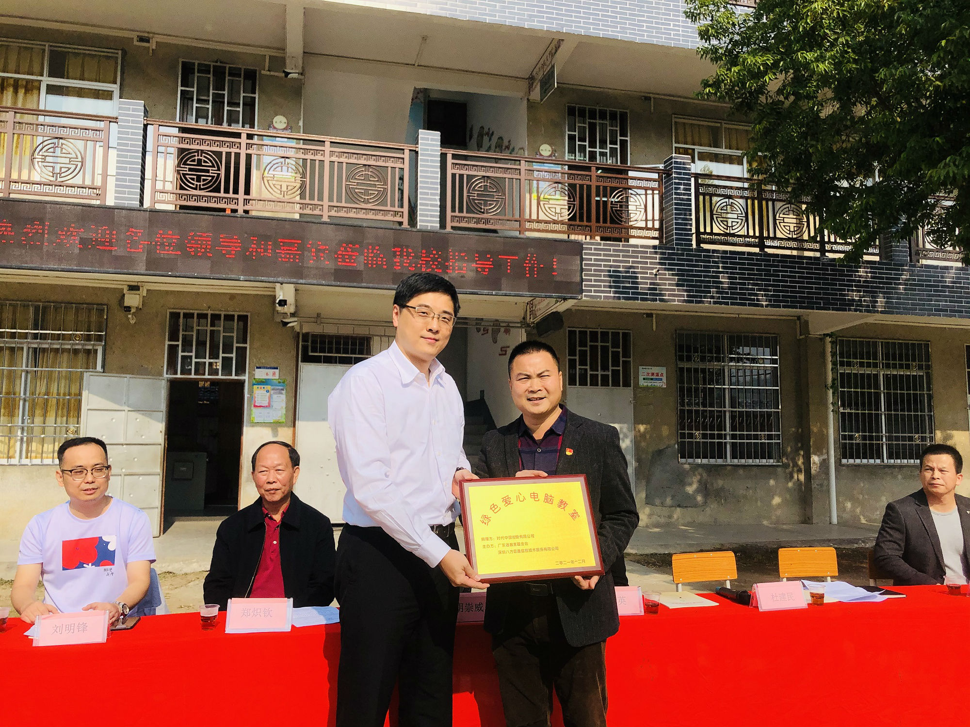 時代中國控股有限公司信息化平臺管理中心胡崇威總經(jīng)理向寨崗鎮(zhèn)中心小學(xué)贈送“綠色愛心電腦教室”牌匾,杜建民校長接收牌匾