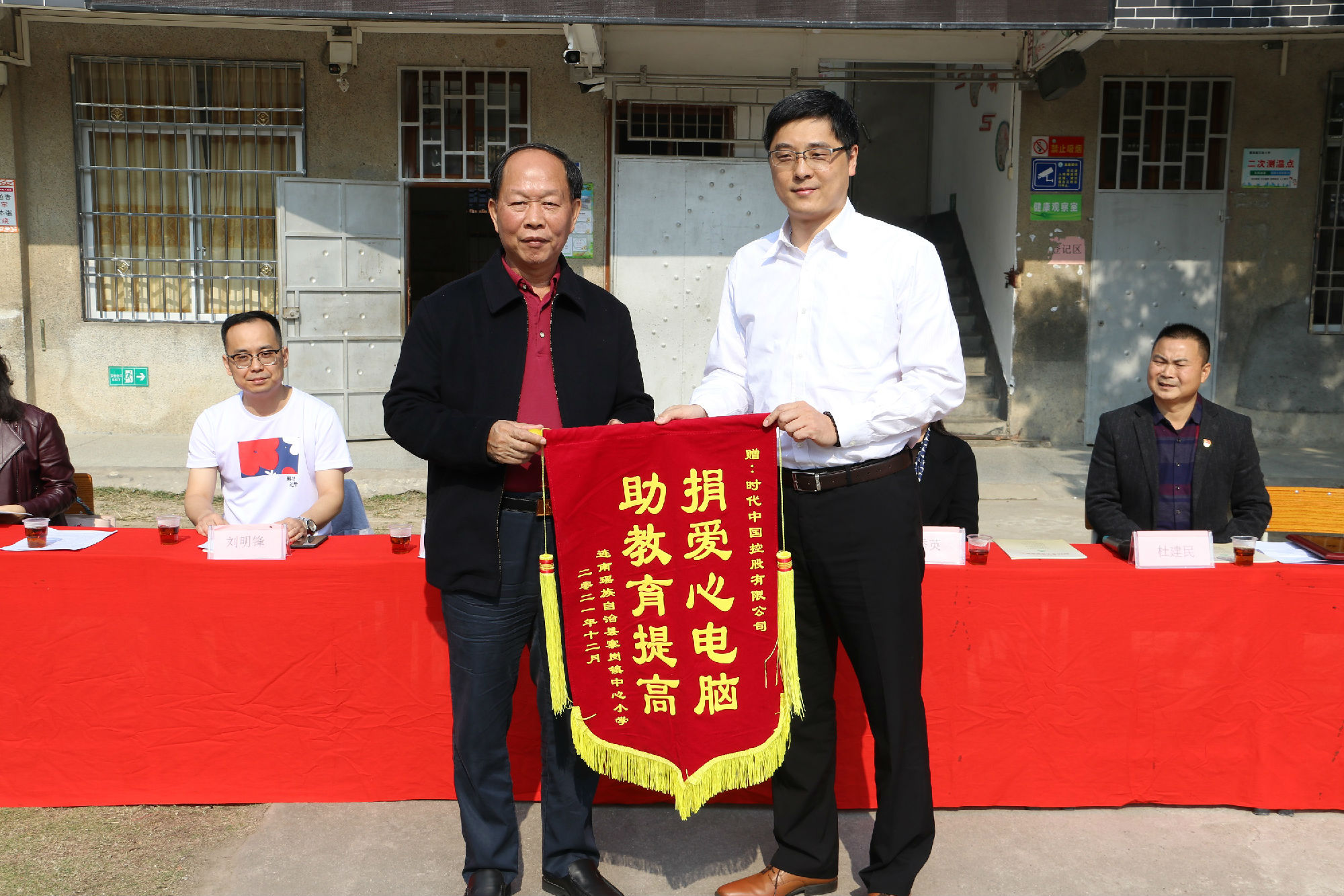 廣東省教育基金會鄭熾欽秘書長向時代中國控股有限公司贈送錦旗,時代中國控股有限公司信息化平臺管理中心胡崇威總經(jīng)理接收錦旗