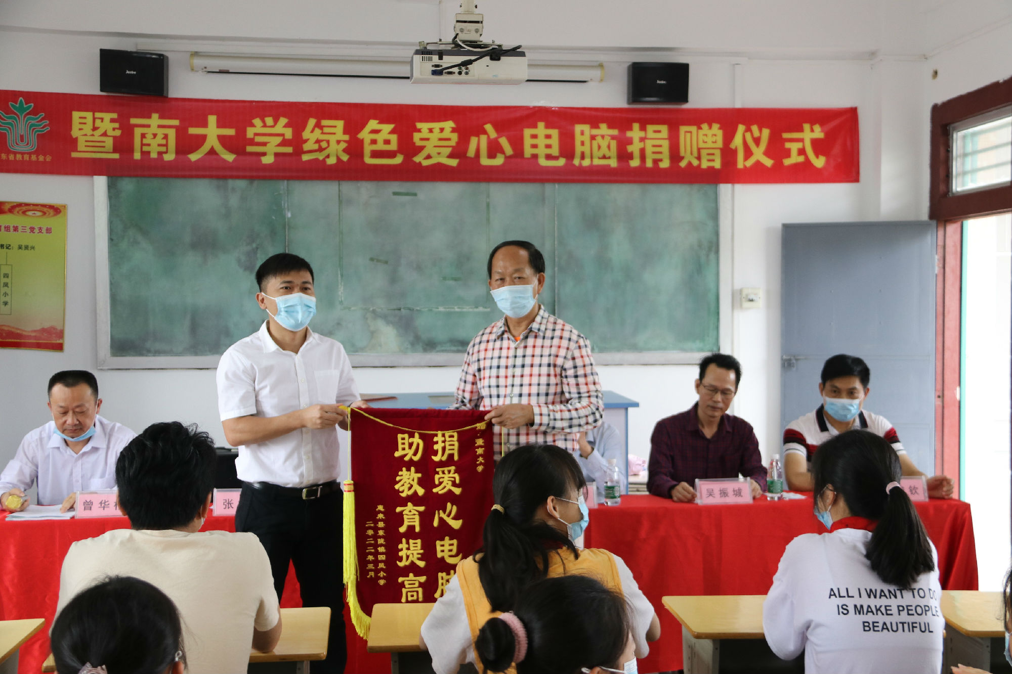 廣東省教育基金會(huì)鄭熾欽秘書(shū)長(zhǎng)向暨南大學(xué)贈(zèng)送錦旗, 暨南大學(xué)張龍釗科長(zhǎng)接收錦旗