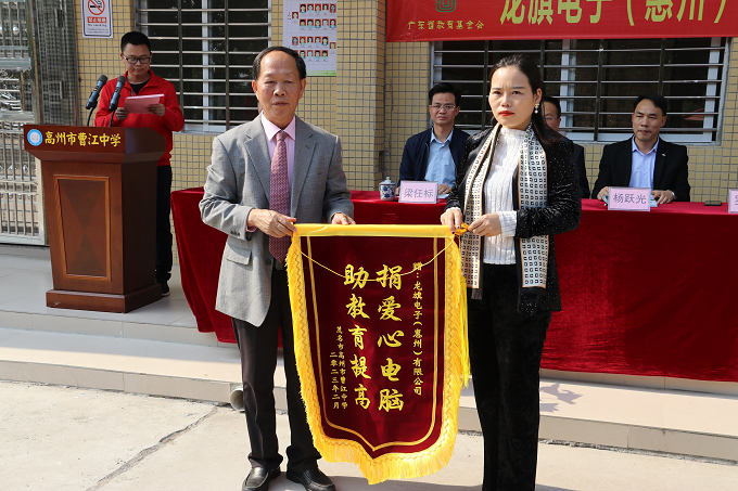 廣東省教育基金會(huì)鄭熾欽秘書長(zhǎng)向龍旗電子(惠州)有限公司贈(zèng)送錦旗,