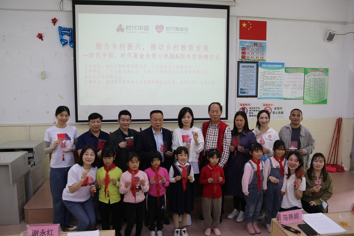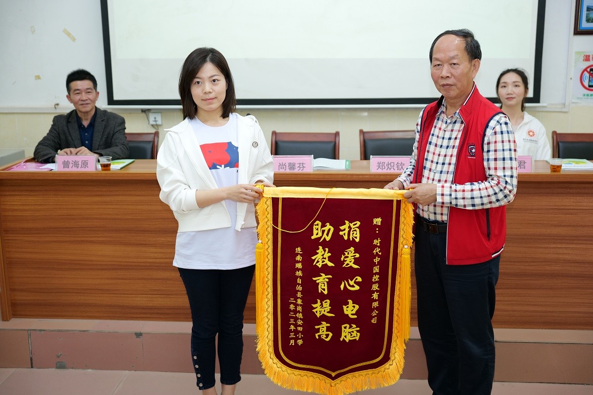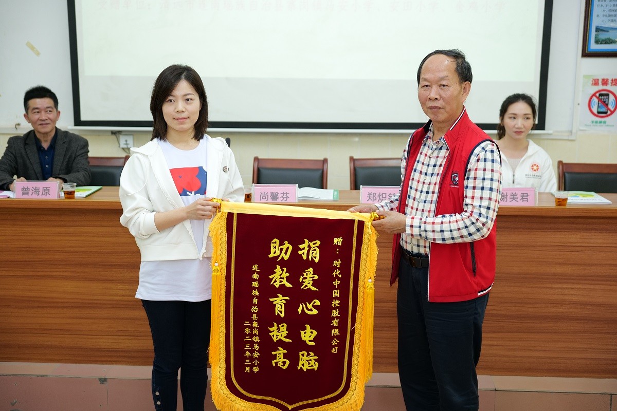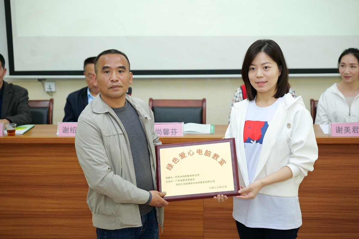 尚馨芬執(zhí)行秘書(shū)長(zhǎng)向連南瑤族自治縣寨崗鎮(zhèn)馬安小學(xué)、安田小學(xué)贈(zèng)送“綠色愛(ài)心電腦教室”牌匾