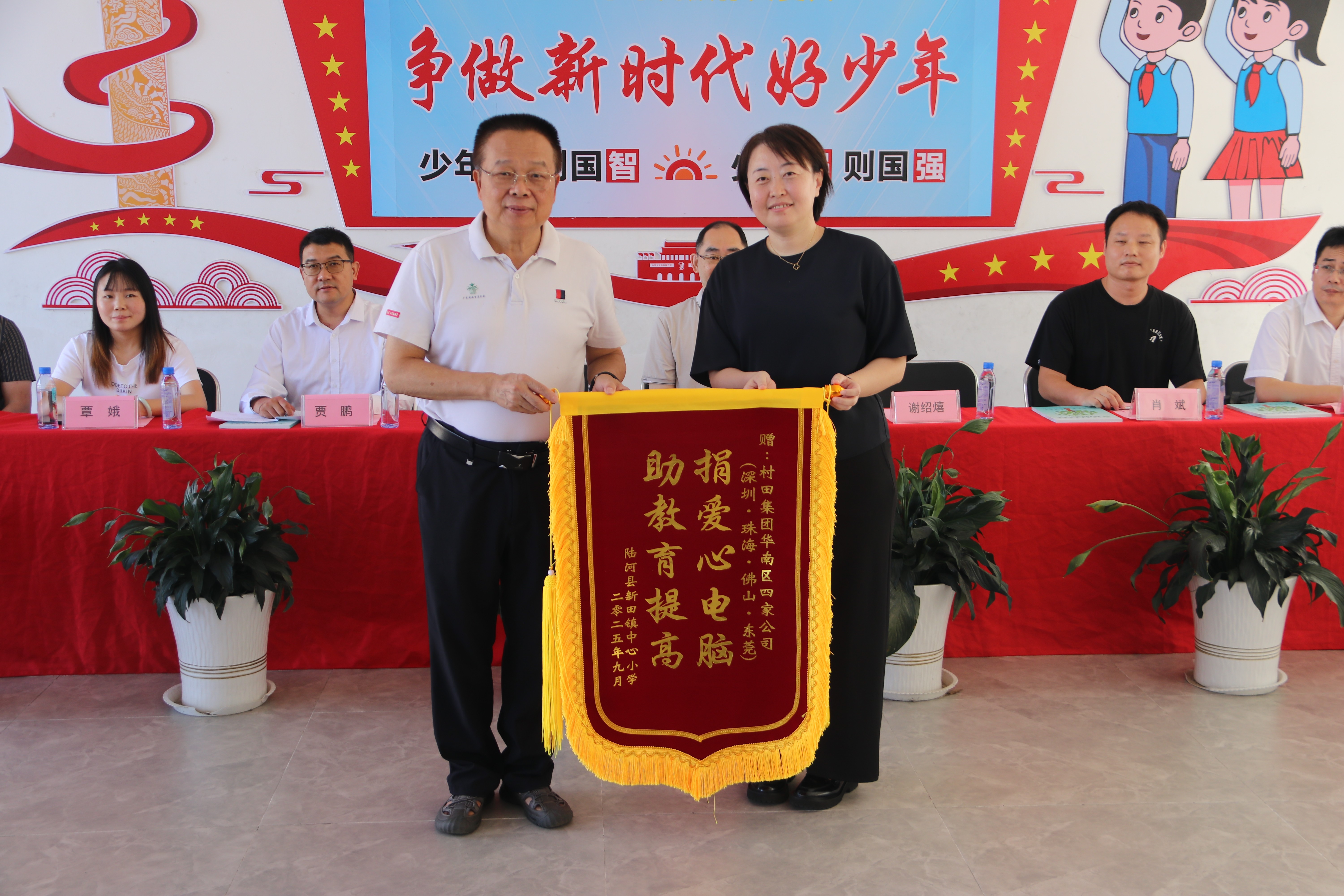 村田集團(tuán)華南區(qū)代表肖斌先生向陸河縣新田鎮(zhèn)中心小學(xué)贈送“綠色愛心電腦教室”牌匾